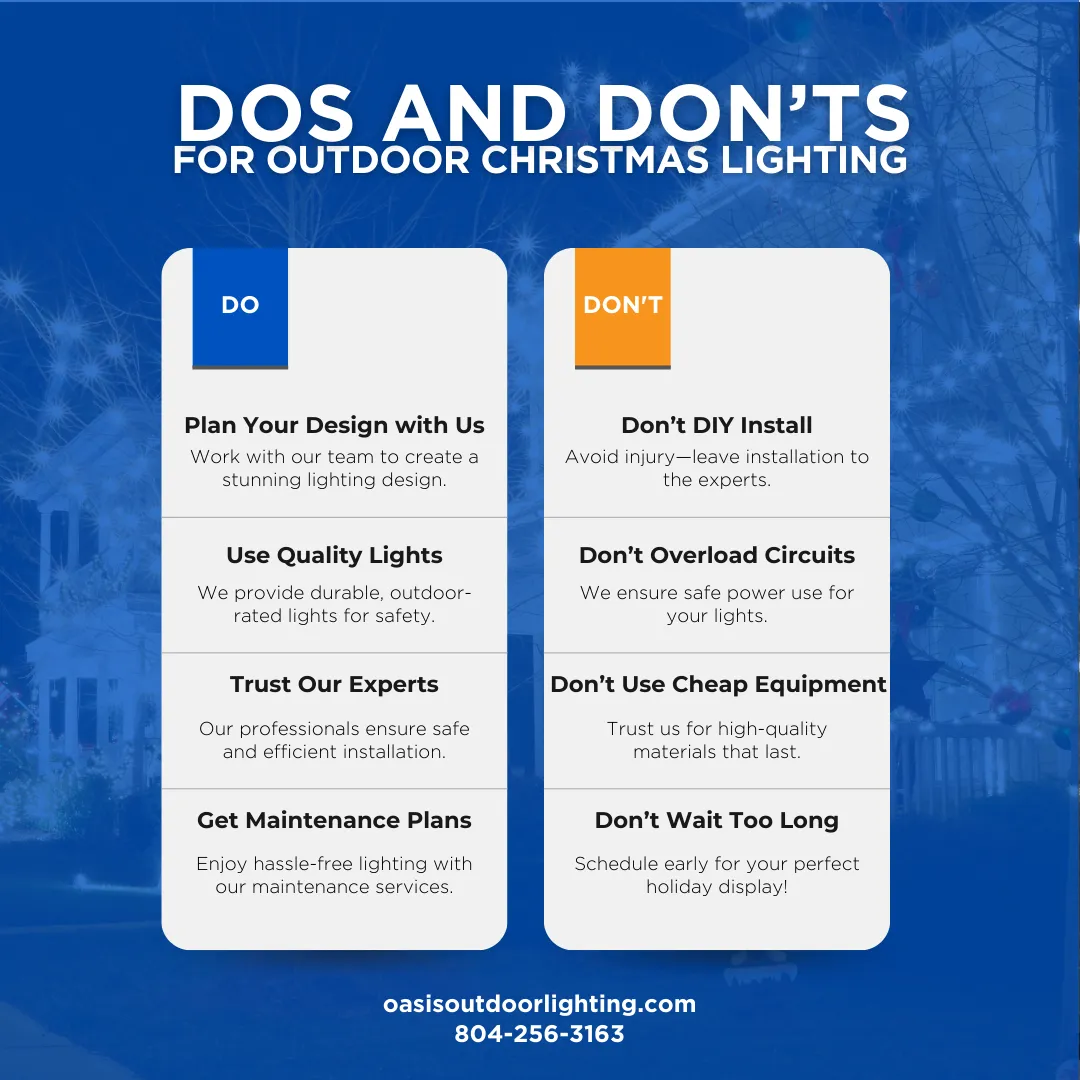 At Oasis Outdoor Lighting, we specialize in creating breathtaking outdoor experiences with custom lighting designs that blend beauty, safety, and functionality. From elegant landscape lighting to festive holiday displays and permanent architectural highlights, our team brings your property to life after dark. Licensed, insured, and proudly serving the Richmond area and nearby communities, we make your outdoors shine—season after season.